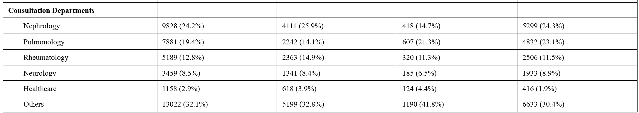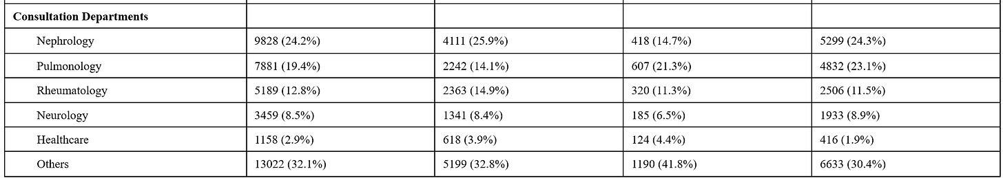 The sample sizes are very good: pre-COVID (n=15,874), mass infection (n=2,844), and post-COVID (n=21,819). But, “the median age was 54 years (38-65), with 52.2% of patients being male, and the highest proportion of patients belonging to the nephrology department, accounting for 24.2%.” The latter is of importance, the blood samples came for people visiting the hospital.