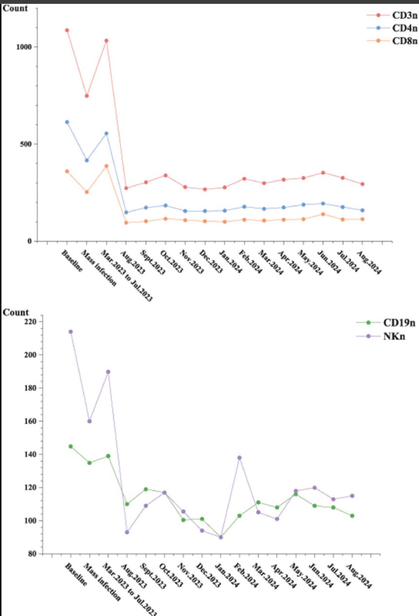 Furthermore, numbers in these patients, as the authors also highlight, do recover and differences are not different in the period just after the mass infection, March-July 2023 (samples were pooled), then suddenly drop from August and remain stable on similar level.