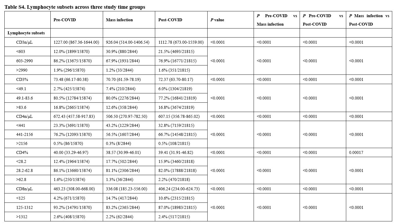 “To investigate lymphocyte subsets of the post-COVID group, we compared the levels with the baseline. Post-COVID, the percentage of B cells (10.23% vs 10.34%, P=0.0065), NK cells (13.33% vs 14.05%, P<0.0001), and CD4+/CD8+ T cells ratio (1.43 vs 1.45, P=0.00013) increased, while the percentage of Th cells (40.00% vs 39.41%, P<0.0001), CD8+ T cells (28.29% vs 27.07%, P<0.0001), T cells (73.48% vs 72.37%, P<0.0001), and counts of Th cells (672.43 vs 607.15 cells/µL, P<0.0001), CD8+ T cells (463.23 vs 406.24 cells/µL, P<0.0001), T cells (1227.00 vs 1112.78 cells/µL, P<0.0001), NK cells (217.82 vs 195.00 cells/µL, P<0.0001) were decreased.“