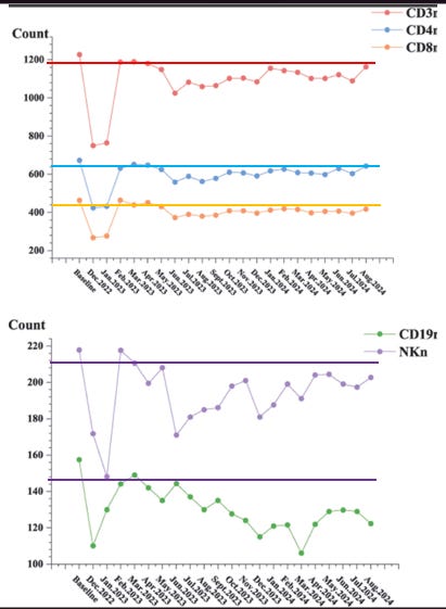 In short, there is no evidence of “a lasting impact on lymphocyte subsets.“ There are suggestions that the pre- and post-Covid cohorts are not similar and the latter is likely undergoing multiple infections compared with the former.