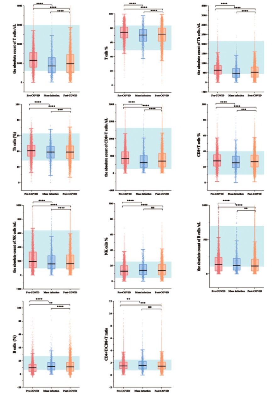 The authors compared lymphocyte subset levels from the mass infection group to those from the pre-COVID group, which served as the baseline. Remember these are different cohorts, and averages are shown. The blue blocks indicate what are considered physiological (normal) values of the white blood cells checked: Total T cells, CD4 (Th) T cells, CD8 T cells, NK cells and B cells.