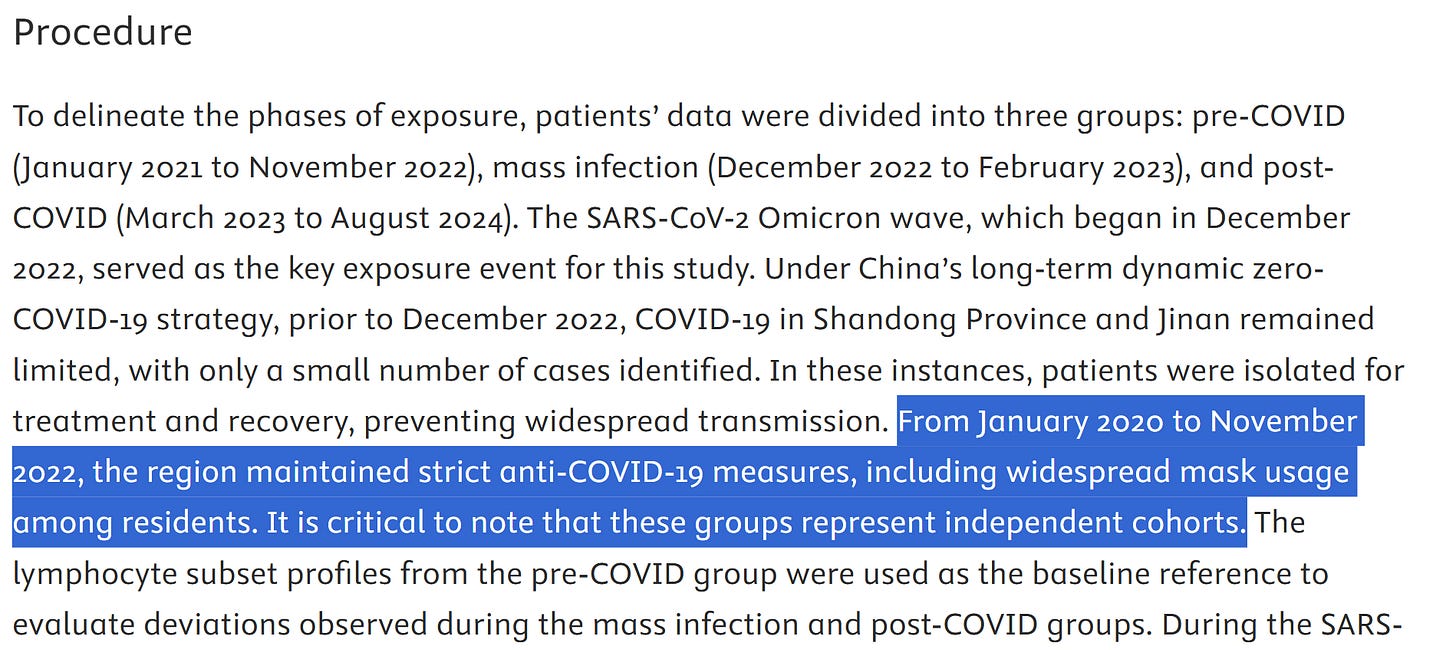 The authors assessed lymphocytes in the blood of three separate cohorts of people in China. There are several pieces of importance. First, China, Shandong Province and Jinan. It can matter where a study is performed due to local circumstances. That is the case here. China has a very strict anti-infection policy after the outbreak of SARS-CoV-2 was acknowledged and has spread in Wuhan. This means for a long time the infection rate was low. The authors nicely make use of this. Their pre-COVID cohort are people providing a blood sample between January 2021 to November 2022. This was the pandemic period and people were not excluded or included based on known infection. However, there will likely be few infected cases due to the very strict measures enforced. Of note, other infections such as RSV, Influenza and other respiratory infections will have been much limited as well.
